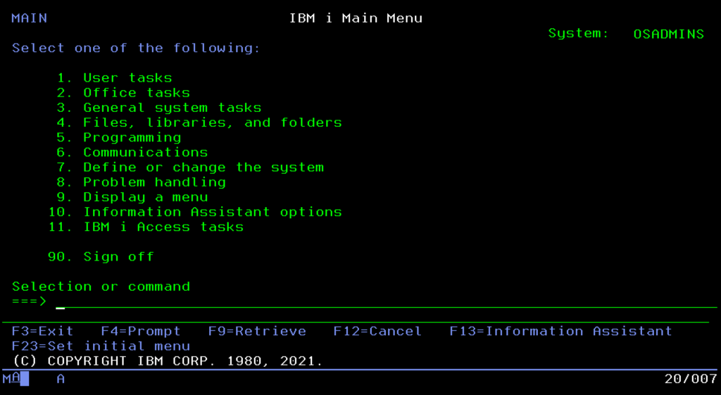 Since we already know the system is powerful and understand its foundations, we must face its “visual” calling card, which also continues to surprise, the famous “Green Screen.” Although to outsiders it looks like a relic of the past, for administrators, the text-based 5250 interface remains a model of ergonomics and speed. Here, time isn’t wasted looking for icons with a mouse, because work is based on muscle memory and a few key shortcuts.