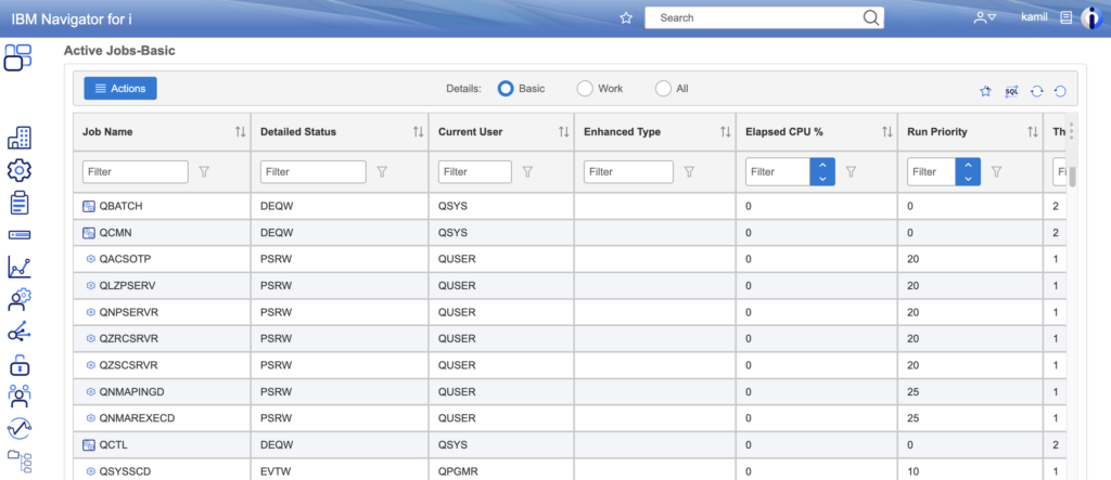 If general indicators are normal but the system seems slow, we reach for the “magnifying glass,” i.e., the command WRKACTJOB (Work with Active Jobs). This is the equivalent of Task Manager, showing a list of all running processes. We can instantly sort tasks by CPU usage here to find the culprit “eating” resources. It is also here that we most quickly catch tasks with the status MSGW (Message Wait), processes that have stopped and are waiting for human intervention, for example, due to an error in the program or lack of paper in the printer.