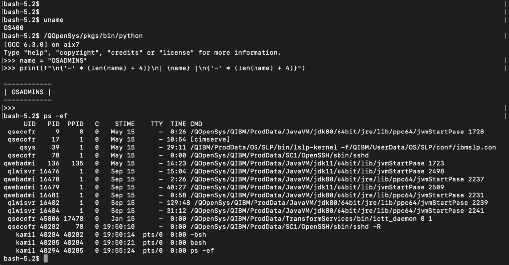 Thanks to PASE, the “green screen” gained new life. Administrators and programmers can run the Bash shell, use the Git version control system, write scripts in Python, or run servers in Node.js. What once seemed impossible on an “accounting” machine is standard today. Managing this inventory is done in a way familiar to every Linux user (Red Hat/CentOS), using the Yum package manager (managing RPM packages). This means that IBM i has become a hybrid platform in the full sense of the word: it can simultaneously process millions of banking transactions in old RPG and serve modern APIs, using the same data and resources.