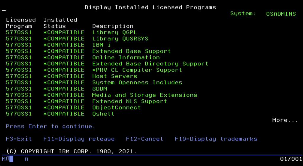 It is crucial to understand here what the system considers a “Licensed Program.” Although we will most often see products provided by IBM in this menu, this mechanism is also open to third-party companies. Professional software vendors (e.g., High Availability tools, ERP systems, or banking solutions) often package their applications in this same standard (LPP – Licensed Program Product). Thanks to this, their software becomes a full-fledged citizen of the system, appears on the official list of installed products, and can be installed and updated with the system command RSTLICPGM, instead of manually restoring libraries. Moreover, it is subject to the same system consistency verification as components provided by IBM. Many smaller applications are distributed in a simpler way (as ordinary libraries), so they are not visible in this menu, but “heavyweight” software usually uses the benefits of LICPGM.