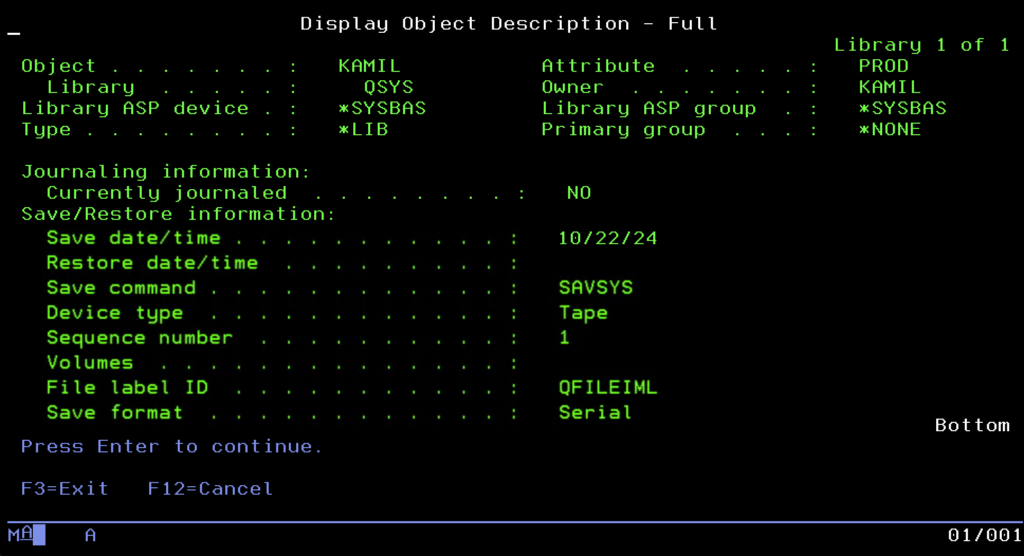 Even the best-secured fortress with the most rigorous access control is useless if it does not have a backup. In the IBM i world, the approach to backup is just as integrated as the rest of the system, relying on a strategy where data recoverability is the absolute priority. At the lowest level, the system offers a set of native commands that allow the administrator to “surgically” extract and save fragments of data. The basic tools here are commands starting with the prefix SAV, such as SAVLIB for libraries or SAVOBJ for single objects. What is extremely important is that every object in this system has its own “memory” of backups. If we inspect its description, we will find precise information there about the date of the last save and the identifier of the volume (tape) it went to. Thanks to this, the administrator, looking at the object itself, knows exactly where to look for its copy without having to dig through external registers.