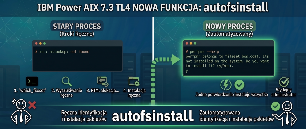 Każdy administrator AIX doskonale zna sytuację, gdy podczas pracy na nowym środowisku okazuje się, że w systemie brakuje potrzebnego polecenia. Do tej pory proces uzupełniania takich narzędzi wymagał przejścia przez ustandaryzowaną procedurę. Należało użyć komendy which_fileset, aby precyzyjnie zidentyfikować, z jakiego pakietu pochodzi poszukiwany plik binarny: